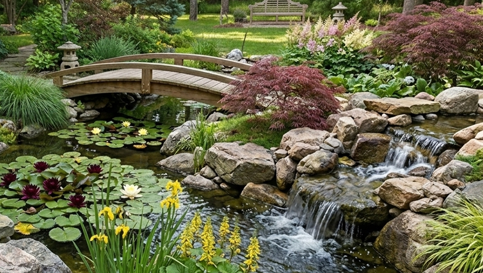 Без водного объекта участок часто кажется сухим и однообразным. Пруд, ручей или каскад добавляют природную пластику, звук текущей воды успокаивает, а отражения в водной глади визуально расширяют пространство.